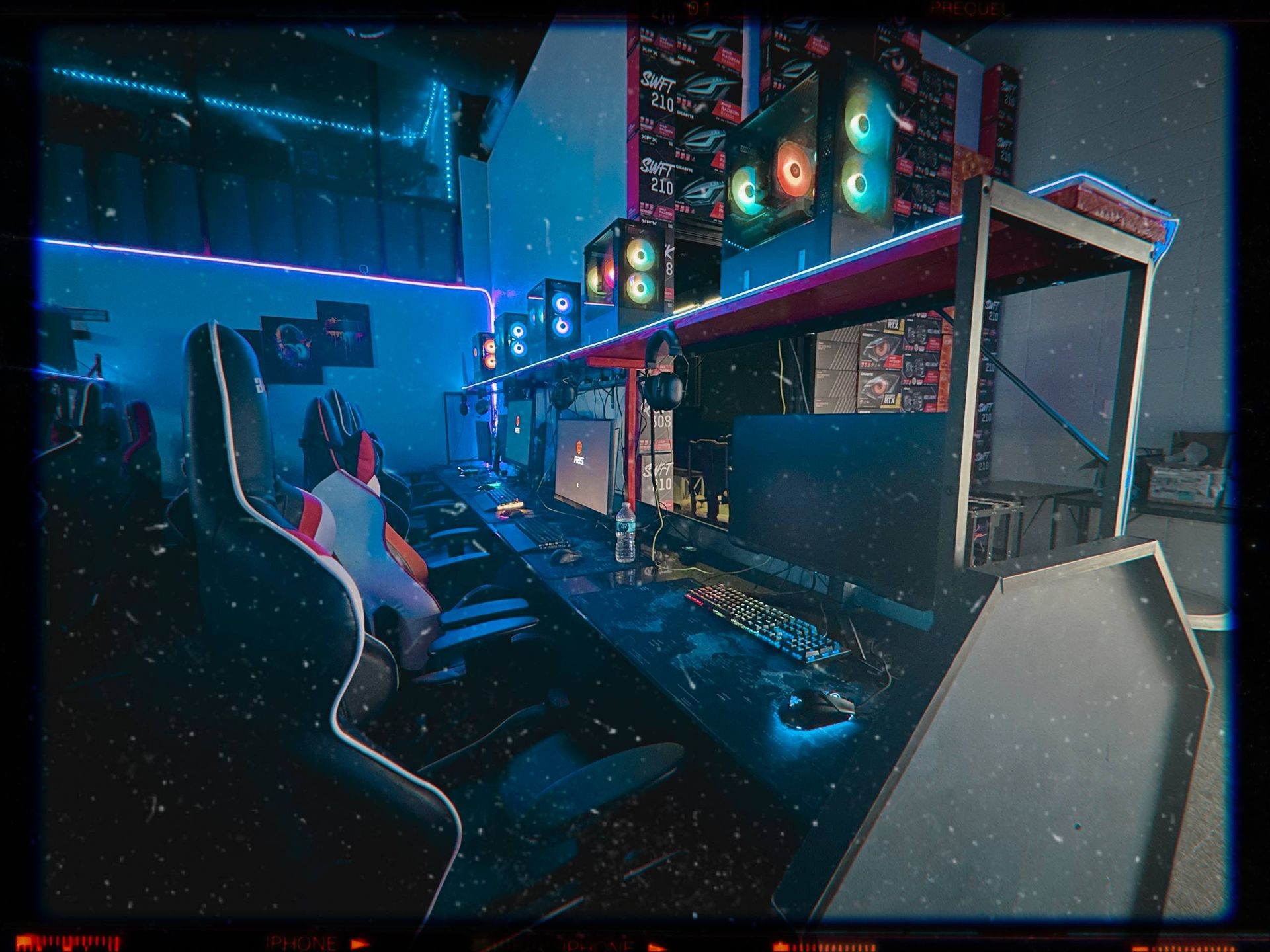 Premium rigs, high refresh monitors, clean setup, esports-ready.
